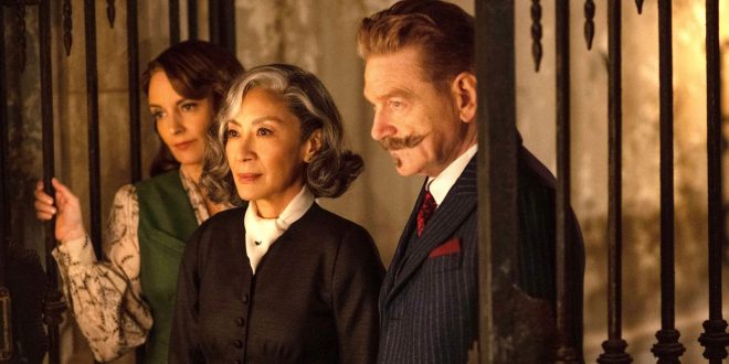 Again, Agatha Christie (1890-1976) commands center stage in theatres capturing the enigmatic, floating, watery wonderland of Venice in 1947; atmospherically lyrical, raucous rain clutches archival architecture on ghostly Halloween. An eerie, spooky soundtrack with dashing drawings, resembling works of Edvard Munch, Wiliam Kentridge, and Kara Walker prance across the screen while children render excitement and terror to the decaying mansion of “Rowena Drake” (Kelly Reilly) who has arranged a séance immediately following the children’s exit; mourning the drowning of her daughter “Alicia” (Rowan Robinson) hires a renowned medium “Joyce Reynolds” (Michele Yeoh) to call forth Alicia’s spirit. Into the muddled maze of protagonists enters retired detective, skeptical, Hercule Poirot (Kennath Branagh), dragged by his friend, mystery author “Ariadne Oliver” (Tina Fey). Predictable obfuscation taints the scenario as participants keep dying, creepy specters resurface, and perpetual Christie shenanigans, instead of titillating are resoundingly stale.