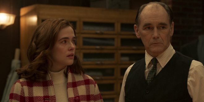 Filmic whiplash has never been more exhilarating, intoxicating; once you feel surefooted, writer/director Graham Moore (“The Imitation Game”) has you spinning out of control, flying out of your seat, knowing you are experiencing the best film of 2022; viewers are incarcerated, on a snowy evening in 1956, Chicago; a tailor’s shop whose proprietor, an expat from London’s Saville Row, “Leonard” (Mark Rylance’s superiority is outstanding) caters to the gangster gang: “Richie” (Dylan O’Brien, spoiled brat perfection) a simpering son of the “Boss” “Roy” (never better, Simon Russell Beale), “Francos” (Johnny Flynn, preeminently obnoxious) a wannabe Kingpin; receptionist “Mable” (Zoey Deutch, subtlety multi-faceted) has an aura of ambition along with a lack of respect for Lenoard, who refers to himself as a “cutter” not a tailor.
